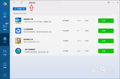 3、找到搜索框,輸入“重裝系統(tǒng)”,并點(diǎn)擊搜索。得到以下界面,時(shí)間不同,搜索收錄的信息不同,所以搜索出的結(jié)果不同,這里聲明一下。