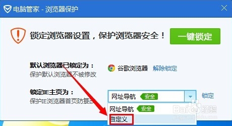 3、在電腦管家“瀏覽器保護(hù)”設(shè)置界面,可以看到主頁(yè)設(shè)置處。下拉菜單選擇“自定義”。