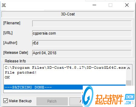 1.裝完成后,先不要運(yùn)行程序,復(fù)制”Patch.exe”到軟件安裝目錄下運(yùn)行,點(diǎn)擊Patch按鈕打補(bǔ)丁即可默認(rèn)路徑C:\Program Files\3D-Coat-V4.8.20
