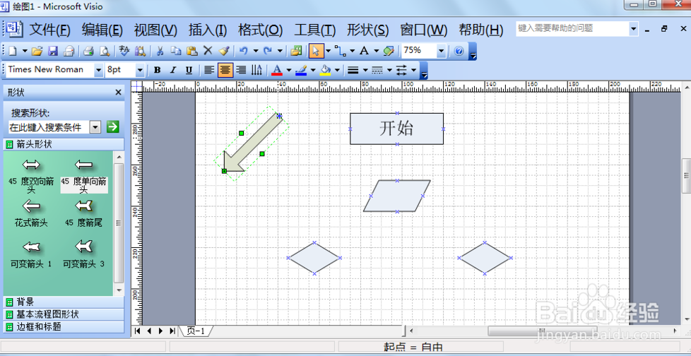 我們將需要流程形狀添加上后,現(xiàn)在需要點(diǎn)擊左側(cè)的“箭頭形狀”,選擇需要的拖動(dòng)到編輯區(qū)。(注按住shift鍵就可以45度為基準(zhǔn),調(diào)整方向)