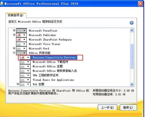 2、然后再次安裝的時候,選擇“自定義安裝”中的“office 共享功能”,將"business connectivity services"設(shè)置為不可用,點擊“繼續(xù)”。