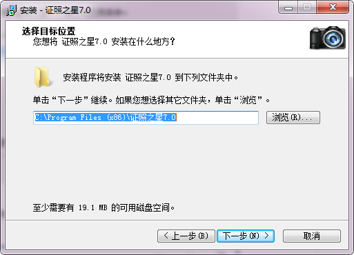 二、進入到證照之星免費版安裝位置選擇界面,如下圖所示,你選擇默認安裝,那么軟件會安裝到系統(tǒng)C盤中,如果你想自定義安裝,那么點擊瀏覽就可以選擇合適的安裝位置,完成后再點擊下一步。小編建議你選擇自定義安裝。