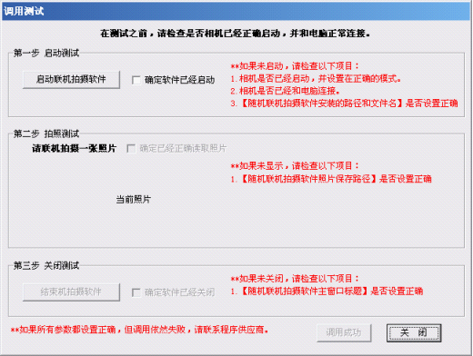 3. 關(guān)閉測試,我們選擇關(guān)閉測試按鈕,聯(lián)機拍攝程序關(guān)閉,后面的確認軟件已經(jīng)關(guān)閉,也打上勾,至此調(diào)用測試已經(jīng)全部完成了。會顯示調(diào)用成功按鈕。