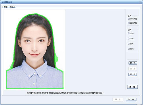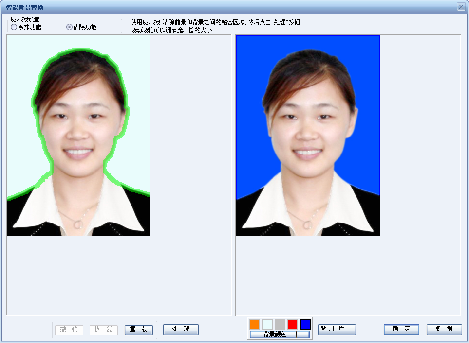 3、點擊“背景處理”,在出現(xiàn)的“智能背景替換”中使用魔術(shù)擦,清楚前進和背景之間的粘合區(qū)域,然后點擊處理。