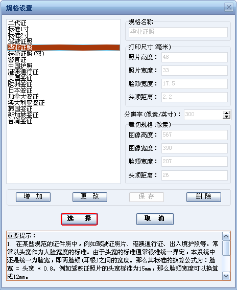 點擊工具欄中“規(guī)格設(shè)置 ”工具按鈕,彈出“規(guī)格設(shè)置”對話框,選擇畢業(yè)證照,在對話框的右邊將會出現(xiàn)標(biāo)準(zhǔn)的畢業(yè)證照打印尺寸、分辨率和裁切規(guī)格,點擊“選擇”按鈕。