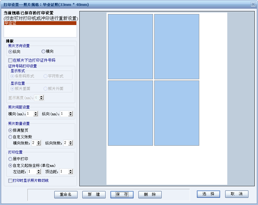 點擊工具欄上“打印設(shè)置”工具按鈕,打開“打印設(shè)置-照片規(guī)格:畢業(yè)證照”對話框。點擊“新建”按鈕,如果本機連接有打印機選擇“本地打印,”否則選擇“送至沖印”,在這里選擇“送至沖印”,選擇紙張名稱,點擊“確定”。然后按照自己的需求設(shè)置排版,點擊“保存”,輸入保存名稱,點擊“選擇”。