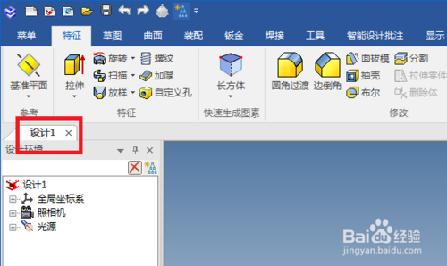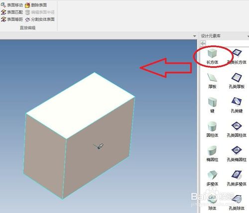 直接從右邊設(shè)計(jì)元素庫(kù)中拖一個(gè)長(zhǎng)方體到三維區(qū)域,作為后面的演示所用。