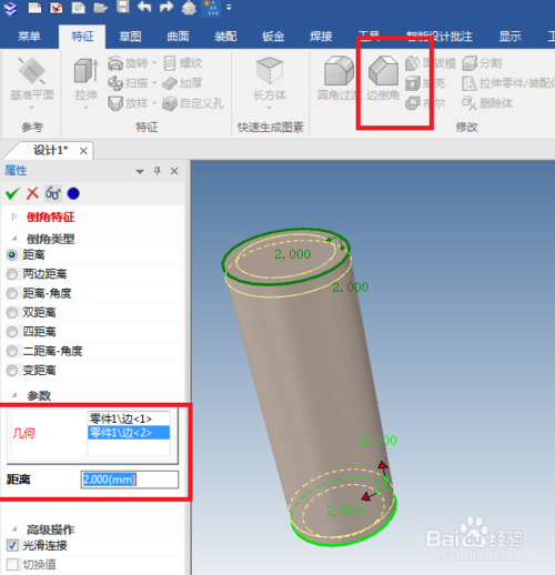 點(diǎn)擊特征工具欄中的“倒角”圖標(biāo),然后加左邊的屬性對(duì)話框,幾何元素一欄選擇圓柱體的上下兩個(gè)邊,距離一欄默認(rèn)為2,不用管,最后點(diǎn)擊上面的√,完成倒角就好了。