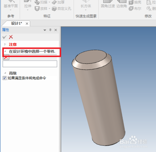 見(jiàn)屬性對(duì)話框中的操作提示:在設(shè)計(jì)環(huán)境中選擇一個(gè)零件,所以這一步我們點(diǎn)擊圓柱體就可以了。