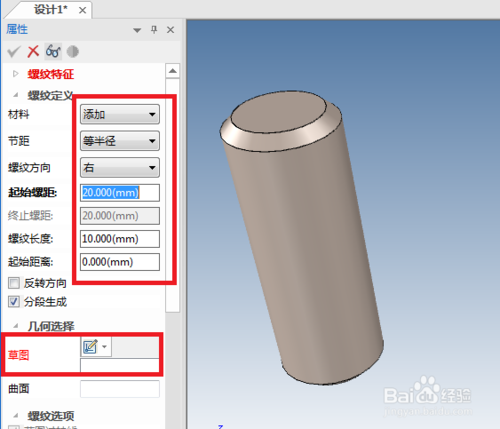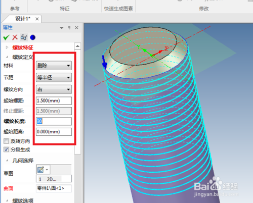 完成草圖繪制之后,回到了螺紋特征屬性對(duì)話框,見(jiàn)紅色框選,材料由添加改成刪除,起始螺距由20.0改成1.5,螺紋長(zhǎng)度由自動(dòng)變成的46改成30,曲面要選擇圓柱體的側(cè)面,最后別忘了打√,就OK了。