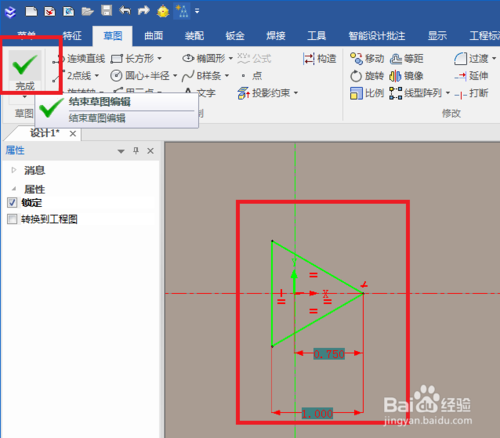 進(jìn)入到草圖狀態(tài),畫(huà)一個(gè)等邊三角形,具體尺寸見(jiàn)下圖,最后點(diǎn)擊“完成“就好了。