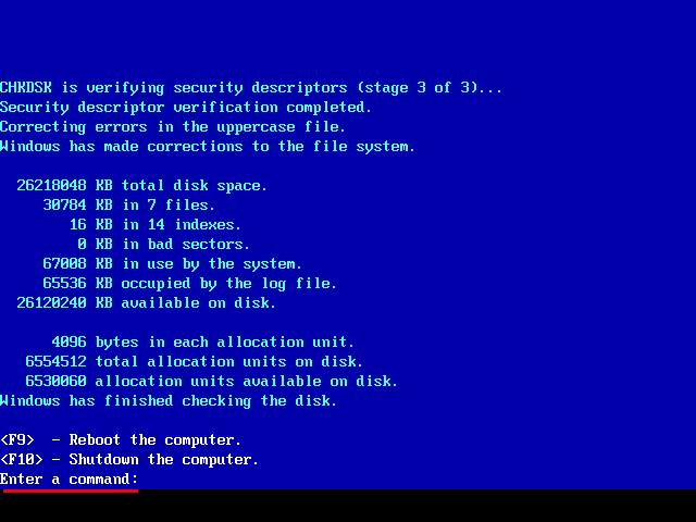 CHKDSK [volume[[path]filename]]] [/F] [/V] [/R] [/X] [/I] [/C] [/L[:size]] volume
