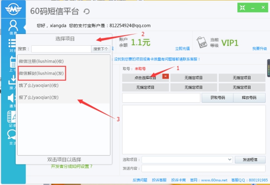 回到信息界面就可以進行收發(fā)碼操作,可以最多可以選6個項目,點擊獲取號碼,進行操作。點擊選擇項目,會出現(xiàn)之前收藏,接入的項目。雙擊確定。