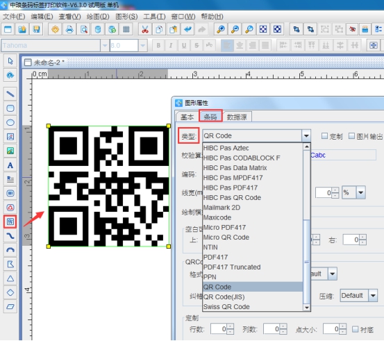 2.點(diǎn)擊軟件左側(cè)的圖形按鈕”繪制二維碼”,在畫(huà)布上繪制二維碼對(duì)象,雙擊二維碼,在圖形屬性-條碼中,可以設(shè)置條碼的類(lèi)型,這里設(shè)置條碼類(lèi)型為QR code.