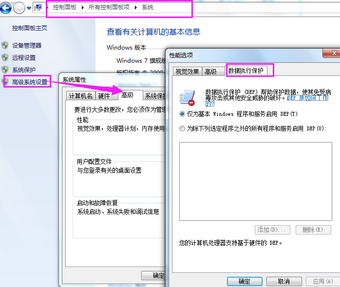 第二步、控制面板>所有控制面板項(xiàng)>系統(tǒng)>高級(jí)系統(tǒng)設(shè)置>高級(jí)>性能>數(shù)據(jù)執(zhí)行保護(hù)設(shè)置。