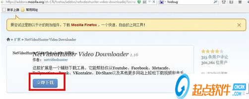 2.打開火狐插件庫, 在右側(cè)搜索Netvideohunter, 如果沒有安裝, 就會在右側(cè)顯示一個[立即安裝]的選項, 點擊就可以安裝, 小編已經(jīng)安裝過了, 所以沒有顯示安裝選項