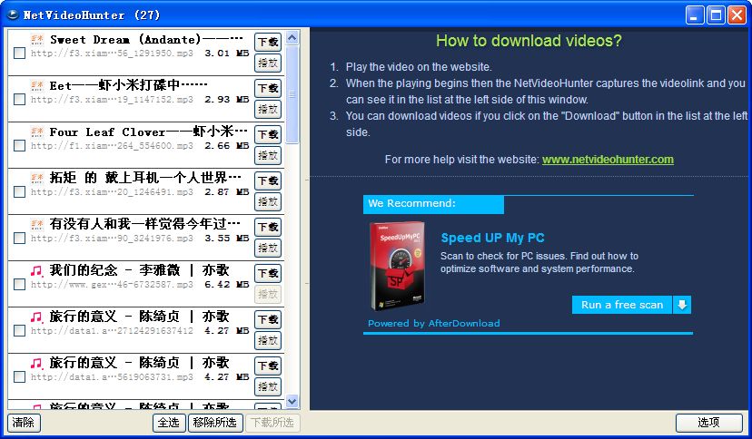 NetVideoHunter是運行在火狐瀏覽器中的擴展程序,該程序被用于掃面網(wǎng)頁中可下載的視頻與音頻,安裝該插件后,用戶就能夠優(yōu)酷,土豆網(wǎng),iFilm,Videoegg,Blip.tv等網(wǎng)站中下載直接下載視頻文件與MP3音樂,該插件的主要特點是能夠根據(jù)下載文件的類型進行自動分類,將同一個視頻文件的所有內(nèi)容全部下載,這對于網(wǎng)頁中分段視頻的管理非常有效,該軟件支持高清下載,為了保證下載速度,您也可以自行在插件中設(shè)置符合網(wǎng)絡(luò)運行環(huán)境的下載模式,非常方便。