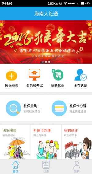 海南人社app是海南省人力資源和社會保障廳指定的一款掌上便民應(yīng)用,基于“移動互聯(lián)+便民生活”設(shè)計理念,集成社保查詢、社保卡業(yè)務(wù)服務(wù)、醫(yī)保服務(wù)、招聘就業(yè)、生存認(rèn)證等便民服務(wù),旨在打造“智慧海南人社”掌上便民服務(wù)平臺。