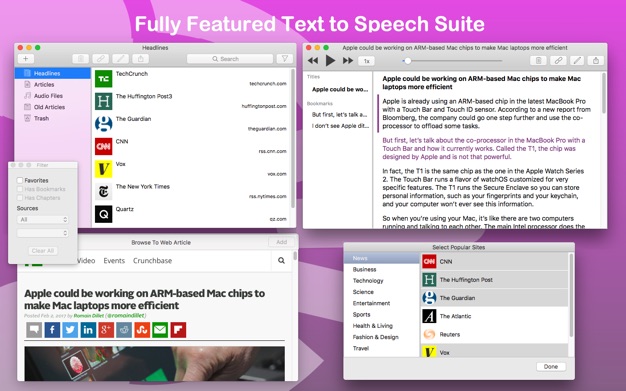 Speech Central Mac版可以從你在應用程序內(nèi)瀏覽的任何頁面創(chuàng)建語音或音頻文件,也可以從任何其他應用程序粘貼互聯(lián)網(wǎng)頁面的鏈接。閱讀的文本及其語言將被自動檢測到。它還可以讀取Microsoft Word (。docx)、PowerPoint (。pptx)、PDF、e - mail (。eml)和許多其他文本文件和電子書格式(。docx)。然后把它們轉化成演講。通過使用該應用程序,您將以一種簡單的方式構建您的知識庫。每個讀取項自動移動到支持強大的搜索和過濾功能的舊文章。這些文本總是可以離線使用。注釋工具用于將項目標記為收藏項,或將其中的重要段落添加書簽。您可以使用app與任何支持的語言進行文本到語音。支持包括觸摸欄在內(nèi)的最新macOS功能。
