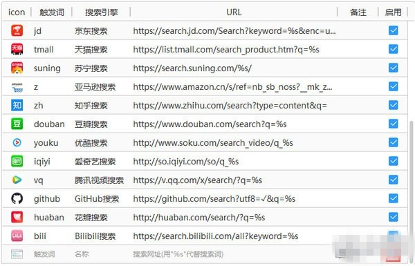 1. 點(diǎn)擊如圖的“+”號(hào)按鈕,從左至右依次為icon,觸發(fā)詞,搜索引擎,url鏈接。