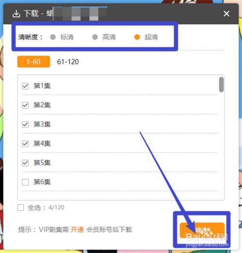 4、選擇我們需要下載視頻的清晰度、集數(shù),點(diǎn)擊【確認(rèn)】