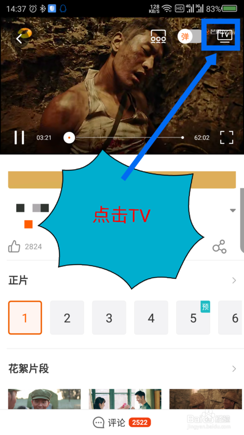 4、點(diǎn)擊播放的畫(huà)面屏幕后,會(huì)出現(xiàn)一個(gè)TV選項(xiàng),點(diǎn)擊右上角的TV選項(xiàng)。如圖所示