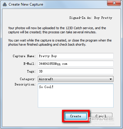 此時在彈出的對話框中任意填寫三維模型的名字等信息,然后點擊Create創(chuàng)建。
