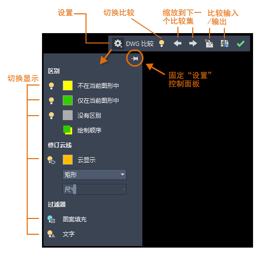 為了便于在比較狀態(tài)下直接編輯,此功能的選項和控件已從功能區(qū)移動到繪圖區(qū)域頂部的固定工具欄。大多數(shù)選項都已合并到“設置”控件中并得到了增強,如圖所示??梢暂p松從工具欄切換比較,以及從“設置”控件切換差異類型的顯示。