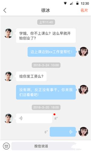 4、點(diǎn)擊通訊錄好友頭像(已有名片的),可進(jìn)行聊天。