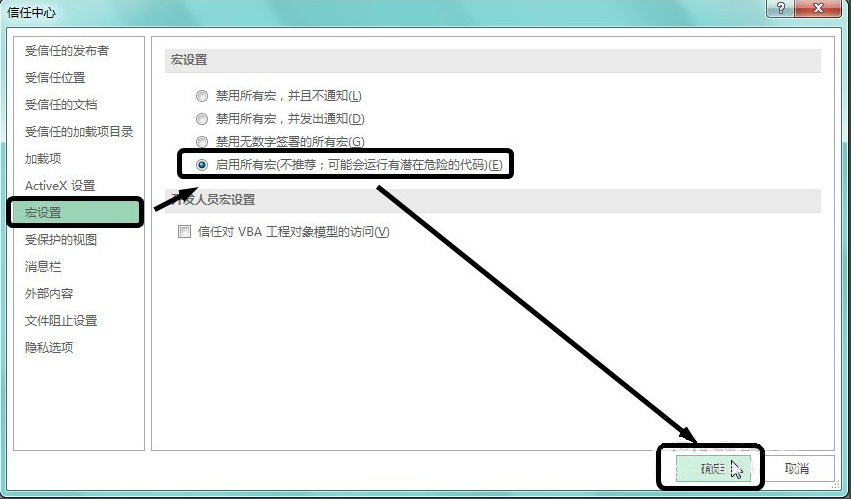 4、在彈出的Excel信任中心設(shè)置界面中,點(diǎn)擊左側(cè)的“宏設(shè)置”選項(xiàng),在右側(cè)宏設(shè)置選項(xiàng)中點(diǎn)擊“啟動(dòng)所有宏(不推薦,可能會(huì)運(yùn)行有潛在危險(xiǎn)的代碼)”選項(xiàng),選擇完成后點(diǎn)擊【確定】按鈕。