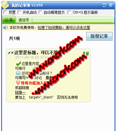 我的記事簿本軟件完全免費使用,可自由傳播.傳播時請保持所有文件的完整,是款很好的桌面記事簿!一些人說打開電腦就忘了很多事,所以我就寫這個我的記事簿軟件.本來也不打算拿出來的。后來想想,應該也有不少人也是需要它吧.所以你就看到它了。