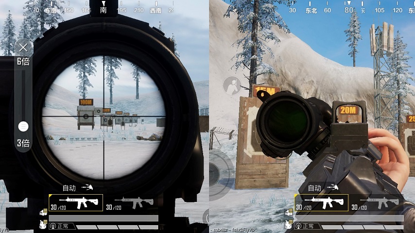 我們再看到中遠距離的倍鏡,在裝備了3倍鏡和4倍鏡的M416后,同樣的距離開鏡效果差別不是特別大,所以小編把它們放在一起和側(cè)瞄準鏡做搭配對比。從對比圖中可以發(fā)現(xiàn),側(cè)瞄準鏡不管是在20米或是100米上,在視野上對這兩種倍鏡的幫助都不大,近的不如它們看得全,稍遠點的又不如它們看得清。但是這種中遠倍鏡雖然視野方面的能力相對比較全面,在攻擊移動對手和移動車輛上面的能力卻遠遠不如側(cè)瞄準鏡這種近距離倍鏡來的順暢,二者如果搭配起來可以算得上錦上添花了。