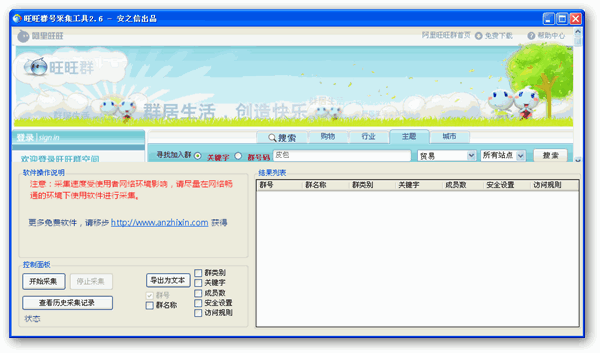 旺旺群號(hào)搜索工具 V2.6 綠色免費(fèi)版 旺旺群號(hào)搜索工具是一款免費(fèi)軟件,能夠根據(jù)用戶設(shè)定的條件,搜索大量旺旺群信息,是您進(jìn)行產(chǎn)品宣傳,網(wǎng)站推廣以及網(wǎng)絡(luò)營(yíng)銷的最好幫手!