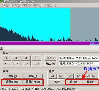 2、播放剪切:除了拖動滑塊之外,你也可在歌曲播放的過程中,設置你需要的剪切區(qū)域。具體操作:點擊“播放”按鈕開始播放歌曲,當播放至切割開始點,就可依次點擊“停止”,再點擊“設置起點”,隨后繼續(xù)進行播放,直至需要的終點再按“停止”,并點擊“設置終點”結束區(qū)域設定