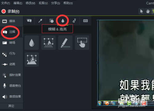 3、接下來就是去水印了,下面說兩種方法,第一種方法我們可以通過馬賽克把水印遮蓋住。在左側(cè)有一個注釋效果選項(xiàng),我們點(diǎn)擊選擇。并在注釋選項(xiàng)下找到一個模糊或者高亮的選項(xiàng)。
