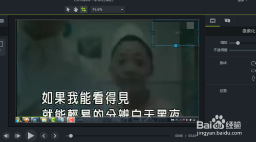 6、第二種方法就是調(diào)整編輯框內(nèi)視頻的大小,讓視頻中有水印的一部分不在編輯框內(nèi)出現(xiàn)就可以了,當(dāng)然這種方法最好是在視頻比較清晰的情況下使用,如果視頻比較模糊的話在把視頻進(jìn)行放大就會更加不清晰了。在右側(cè)有視頻的屬性編輯框,其中有一個縮放選項(xiàng),我們可以通過鼠標(biāo)來滑動上面的軸標(biāo),達(dá)到視頻的縮放效果。我們在這里把視頻放大,使有水印的部分不再編輯框內(nèi)出現(xiàn)。
