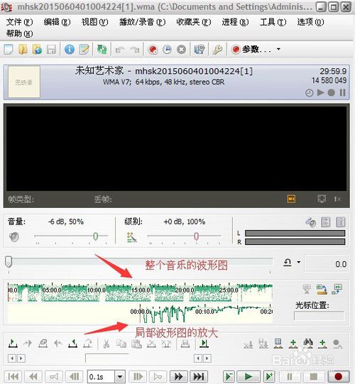 軟件會自動生成該音樂的波形圖,第一個箭頭所指的是整個音樂的波形圖,第二個箭頭所指的是當(dāng)前播放時(shí)間的局部波形圖。