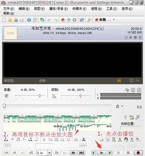 先點(diǎn)擊播放按鈕開始播放,不斷點(diǎn)擊局部波形圖來尋找需要剪輯的開頭。