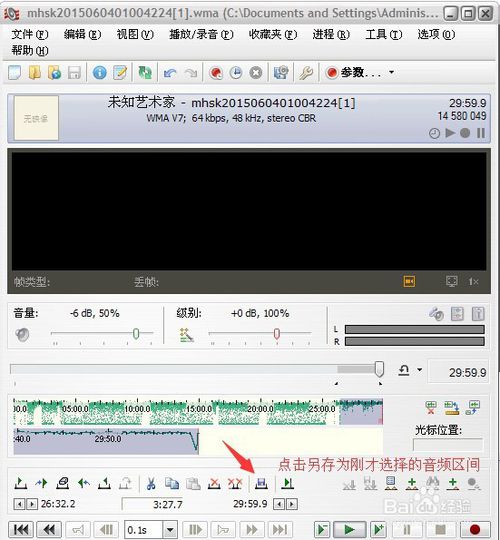 這時(shí)想要剪輯的音樂的波形圖就被選中了,點(diǎn)擊“選擇區(qū)另存為”按鈕進(jìn)行另存為。