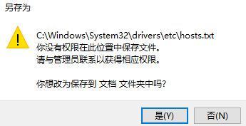 如果保存 hosts 時(shí),彈出以下對(duì)話框,則說(shuō)明目前的用戶權(quán)限不足,需要按下面的方法提高權(quán)限。