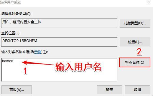 步驟四:輸入你想要提高權(quán)限的電腦用戶名(我的用戶名是 homex),點(diǎn)擊「檢查名稱」,然后點(diǎn)擊「確定」。