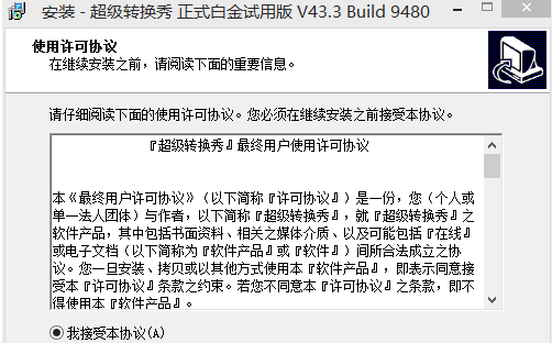 2.接下來(lái)將跳轉(zhuǎn)的是超級(jí)轉(zhuǎn)換秀安裝協(xié)議界面截圖:在該界面里需要小伙伴大致閱讀超級(jí)轉(zhuǎn)換秀軟件的安裝協(xié)議(建議此處不要直接跳過(guò),如選擇跳過(guò)就被視為是同意該協(xié)議),閱讀后可單擊【下一步】按鈕繼續(xù)安裝;