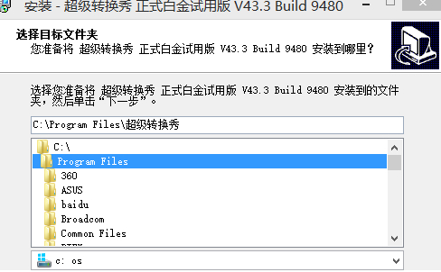 3.接下來(lái)跳轉(zhuǎn)至超級(jí)轉(zhuǎn)換秀安裝目錄截圖界面:在該界面里小伙伴們可選擇設(shè)置超級(jí)轉(zhuǎn)換秀文件安裝位置,在設(shè)置安裝目錄位置時(shí)小編建議大家不要安裝在C盤(pán)下,以免拖慢系統(tǒng)進(jìn)程。設(shè)置完畢繼續(xù)單擊【下一步】按鈕進(jìn)行安裝;