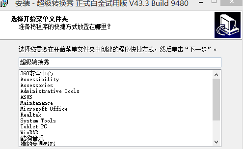 4.接下來(lái)跳轉(zhuǎn)如下截圖界面:該界面是可以設(shè)置超級(jí)轉(zhuǎn)換秀快捷方式的放置位置,小伙伴可根據(jù)自己習(xí)慣進(jìn)行設(shè)置該位置,設(shè)置完畢后繼續(xù)單擊【下一步】按鈕繼續(xù)安裝。