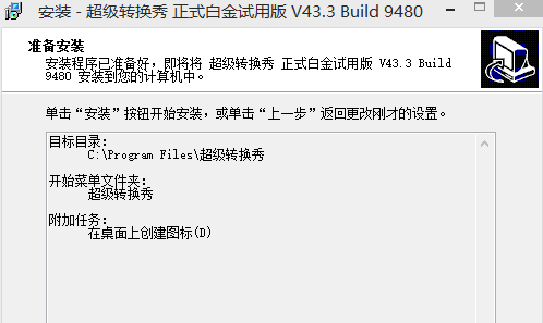 6.以上都設(shè)置完畢后將跳轉(zhuǎn)至確認(rèn)超級(jí)轉(zhuǎn)換秀安裝信息界面,如下圖:在該界面我們可以看到自己之前已經(jīng)設(shè)置過(guò)的信息,確認(rèn)無(wú)誤后我們就可以單擊【下一步】按鈕繼續(xù)最后的安裝了;