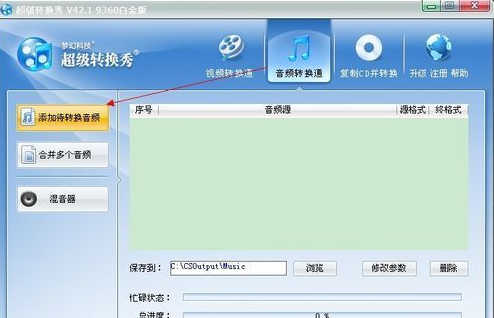 1.首先找到已經(jīng)安裝好的超級(jí)轉(zhuǎn)換秀,雙擊程序打開(kāi)。如下是打開(kāi)后的軟件界面截圖:根據(jù)圖中提示我們需要先找到【音頻轉(zhuǎn)換】點(diǎn)開(kāi)后找到【添加待轉(zhuǎn)換音頻】。