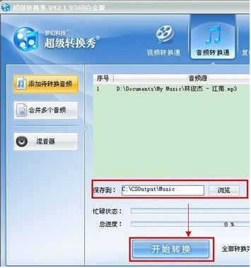 4.跳轉(zhuǎn)至以下界面時(shí)我們需要設(shè)置需要將轉(zhuǎn)換好的音頻存儲(chǔ)到哪里,然后我們就可以單擊【開(kāi)始轉(zhuǎn)換】按鈕開(kāi)始轉(zhuǎn)換。