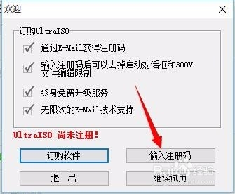 2、安裝完成之后我們需要輸入注冊(cè)碼才能使用UltraISO,因?yàn)檫@是一款收費(fèi)的軟件,點(diǎn)擊右邊的輸入注冊(cè)碼然后點(diǎn)擊確定即可,之后再重新打開(kāi)UltraISO軟件就可以使用了。