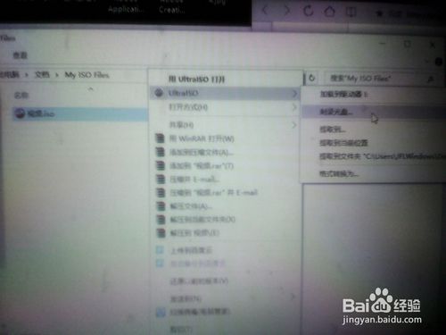 6、找到剛剛創(chuàng)建的ISO文件,右擊ISO 文件然后鼠標(biāo)移動(dòng)到UltraISO點(diǎn)擊刻錄光盤(pán)(或者是右擊ISO文件用UltraISO打開(kāi)再點(diǎn)擊中間的刻錄光盤(pán)的圖標(biāo)),之后在刻錄的時(shí)候先點(diǎn)擊擦除(相當(dāng)于格式化光盤(pán),如果不先擦除則會(huì)提示這個(gè)光盤(pán)有數(shù)據(jù))再點(diǎn)擊將刻錄校驗(yàn)選勾(刻錄校驗(yàn)是為了保證刻錄結(jié)果的完整性),然后點(diǎn)擊刻錄,這時(shí)只要等待片刻即可刻錄完成。