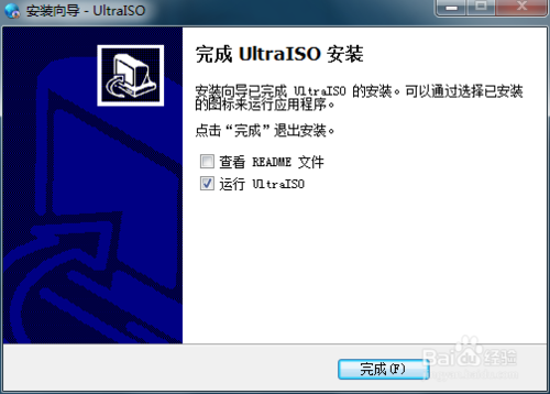 2、運(yùn)行 ---> 選擇對話框的“運(yùn)行UltraISO”選項(xiàng),然后點(diǎn)擊完成按鈕